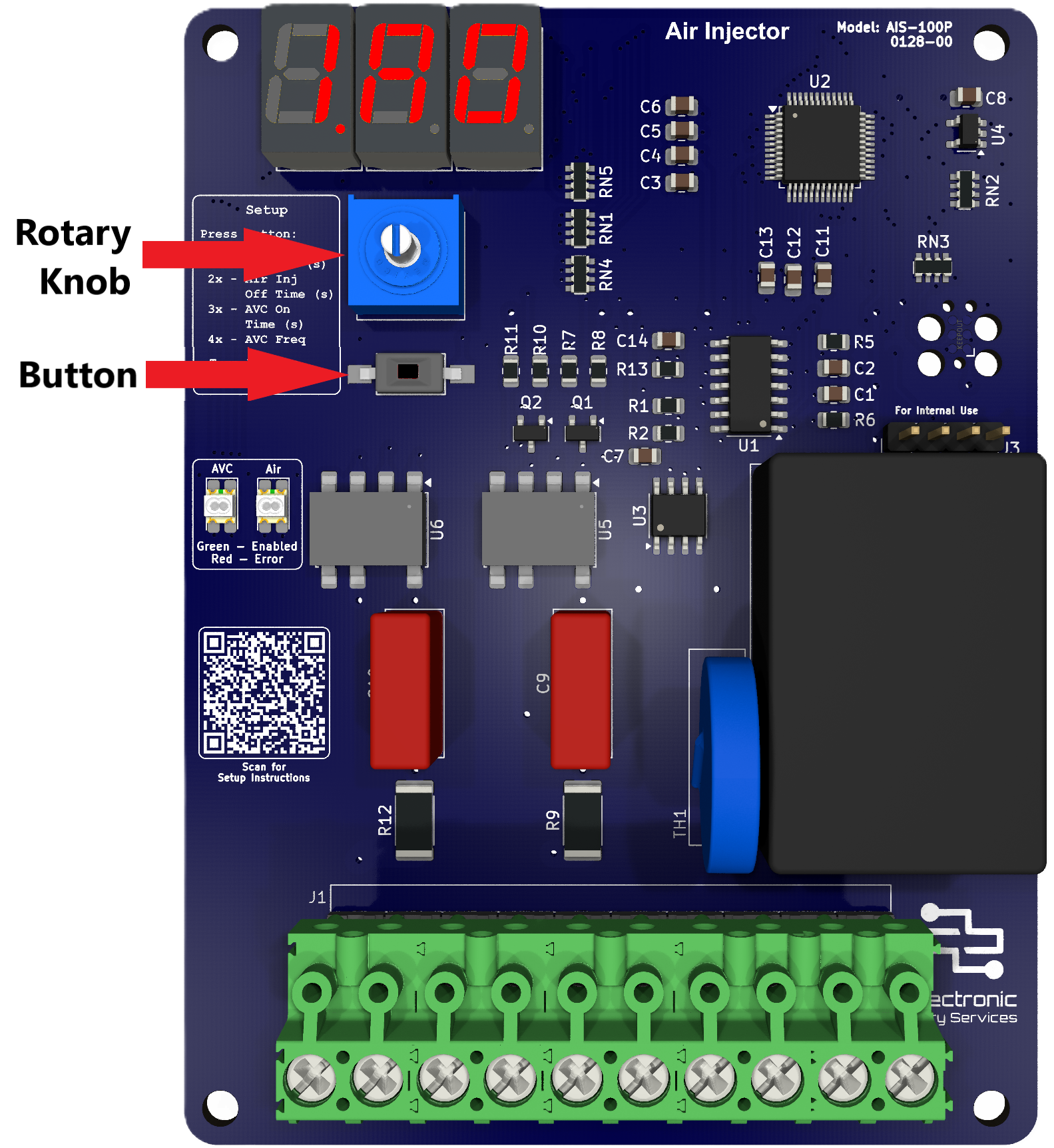 Apply power and configure the AIS-100 using a combination of the button, rotary knob and 7-segment display. Begin by pressing the button: