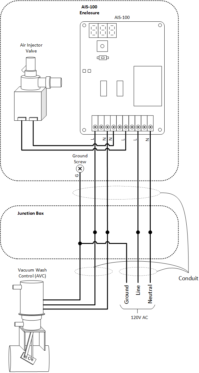 Connect the Air Injector Valve and Vacuum Wash Control (AVC) as shown in the image and provide 120V power. Route all wires through conduit. See manual for more details.